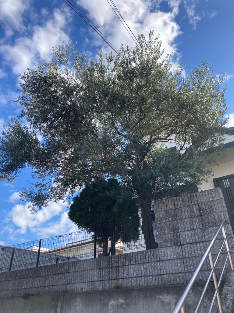 我が家は1階分土地が上がっているので、駐車場で子供たちが降ってくるオリーブをキャッチすることに!