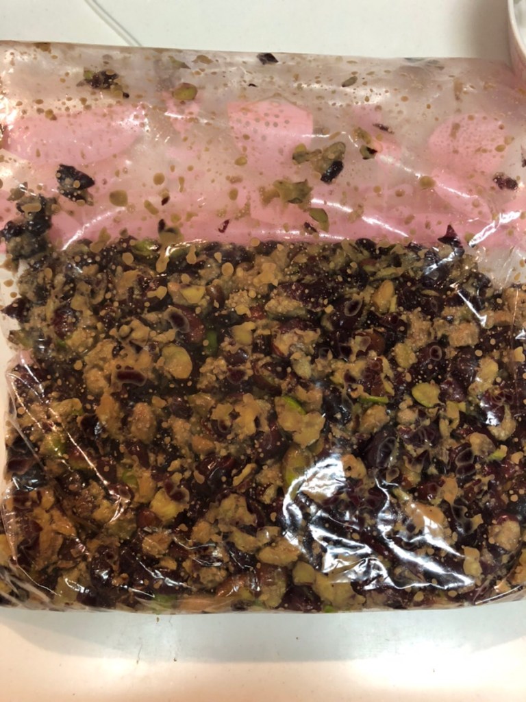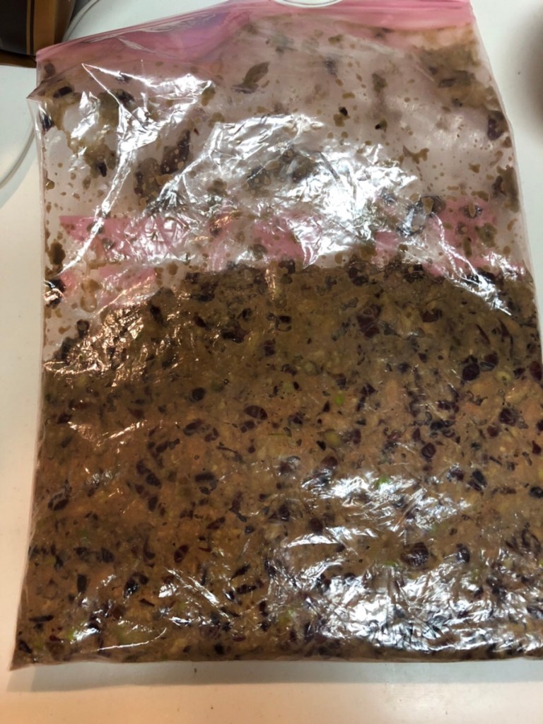 収穫した実を水で洗って、ミキサーで砕きます。砕いた実をジップロックに入れて、実と種をしっかり分離させてモミモミしていきます。このモミモミ作業が一番しんどいです。かたい種から実をはがすのに手が痛くなります。種の周りに油分が多いそうです。