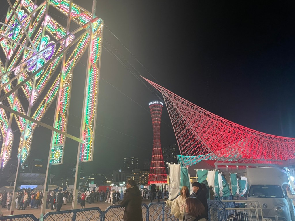 イルミネーションやポートタワーを見ながら、寒い中食べるから揚げや肉巻きおにぎりは絶品でした。